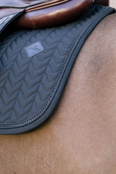 Black Saddle Pad Metal Chain Jumping to elegancki, skokowy czaprak w kolorze czarnym, wyróżniający się ozdobnym wykończeniem w formie metalicznej lamówki / „łańcuszka”. Model przeznaczony do siodeł skokowych, zapewnia schludny wygląd na treningu i zawodach, a jednocześnie wspiera komfort konia podczas pracy.