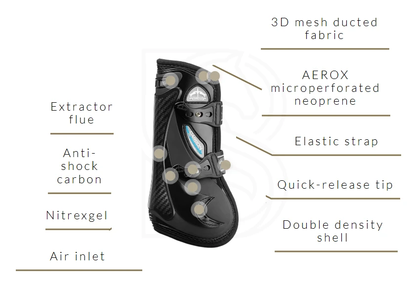 Veredus Carbon Gel Vento (przód) to zaawansowane ochraniacze ścięgien na przednie nogi, stworzone z myślą o maksymalnej ochronie i bardzo dobrej wentylacji podczas treningu oraz startów. Model łączy wytrzymałą skorupę z technologią Carbon + Gel oraz systemem Vento, który wspiera intensywną cyrkulację powietrza i pomaga utrzymać nogę suchą nawet przy dużym wysiłku.