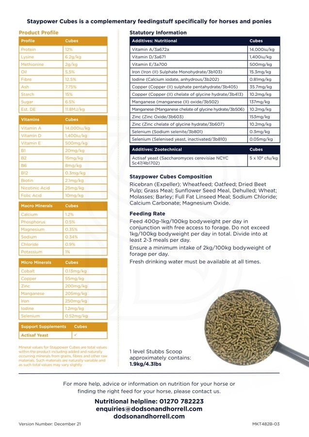 Dodson & Horrell Staypower Cubes 20kg - niskoskrobiowa pasza dla koni sportowych