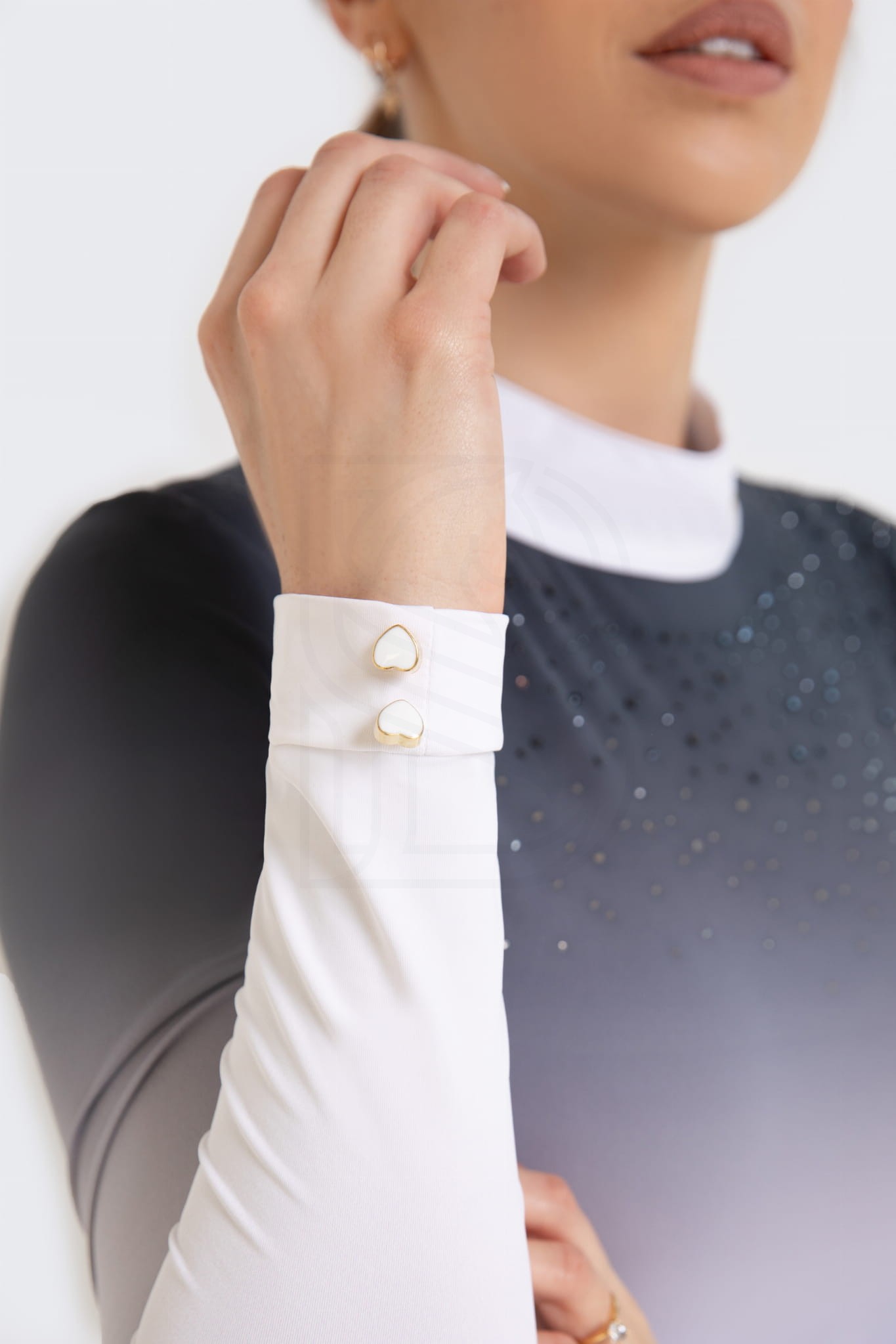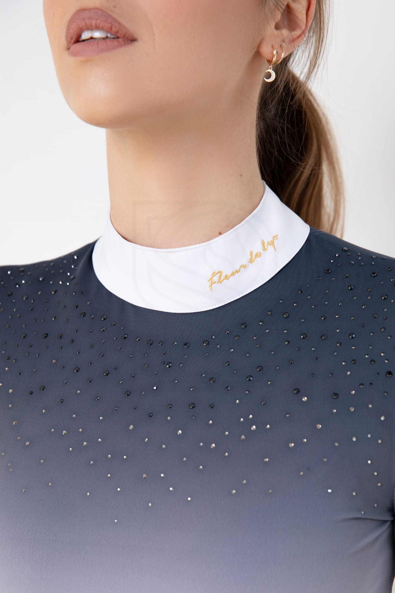 To autorski projekt, który wyznacza nowe trendy w modzie jeździeckiej – nowoczesny, a jednocześnie ponadczasowy. Tkanina w efekcie szarego ombre delikatnie przechodzi tonalnie, nadając koszuli głębi i lekkości. Całość dopełniają subtelne diamenciki, które pięknie połyskują w ruchu, nie tracąc przy tym sportowej elegancji.