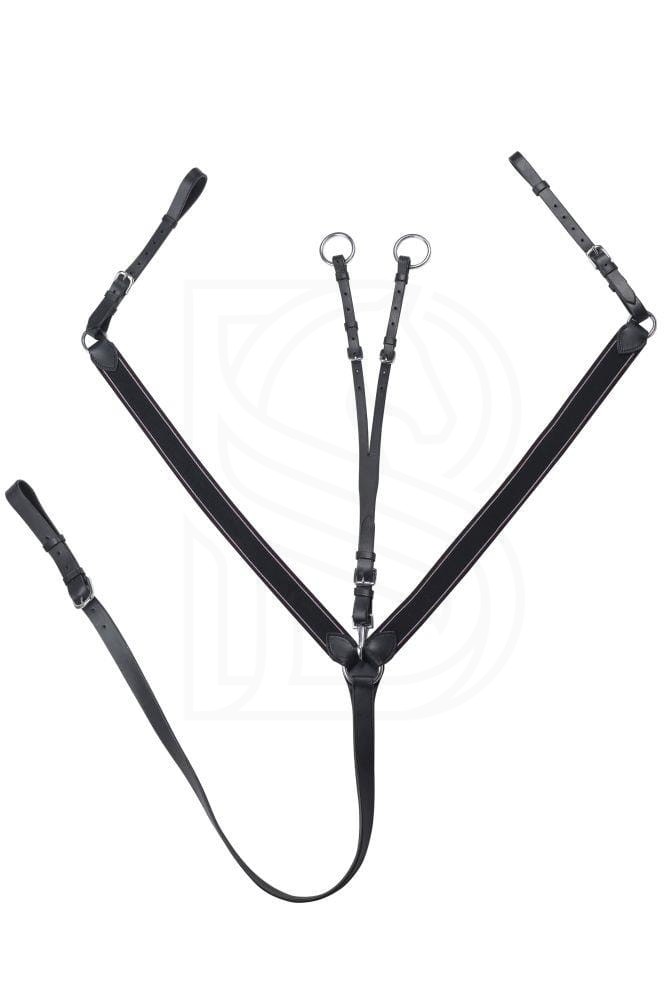Model został wyposażony w elastyczne wstawki, które zapewniają większą swobodę ruchu łopatek oraz lepsze dopasowanie do budowy konia. Dzięki temu napierśnik stabilizuje siodło, nie ograniczając naturalnej pracy przodu konia. Wbudowany wytok wspiera prawidłowe ustawienie głowy i szyi, pomagając utrzymać równy kontakt z pyskiem.