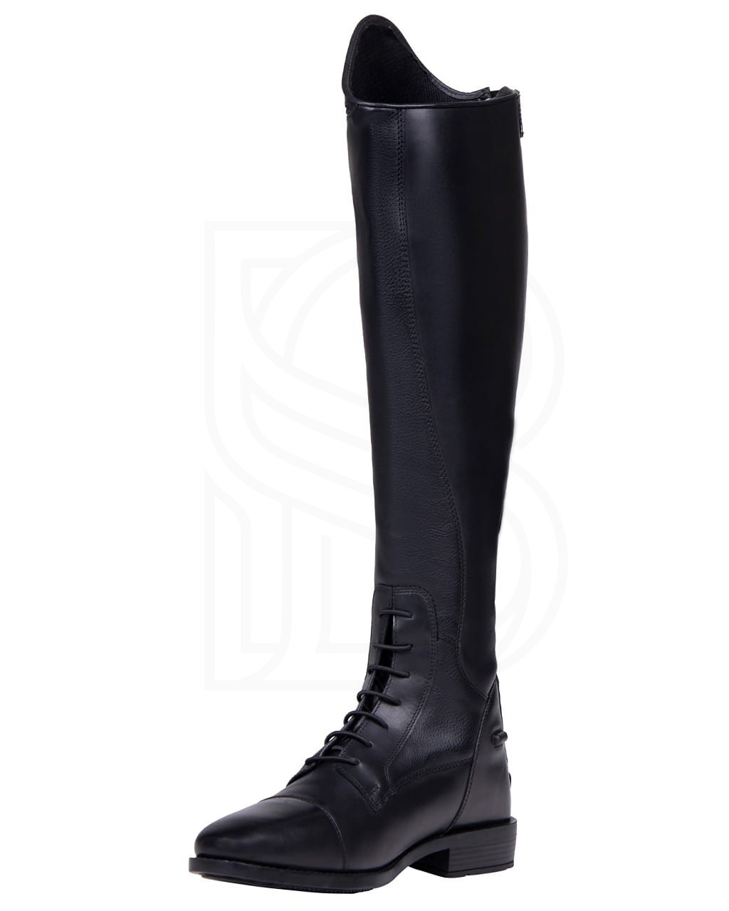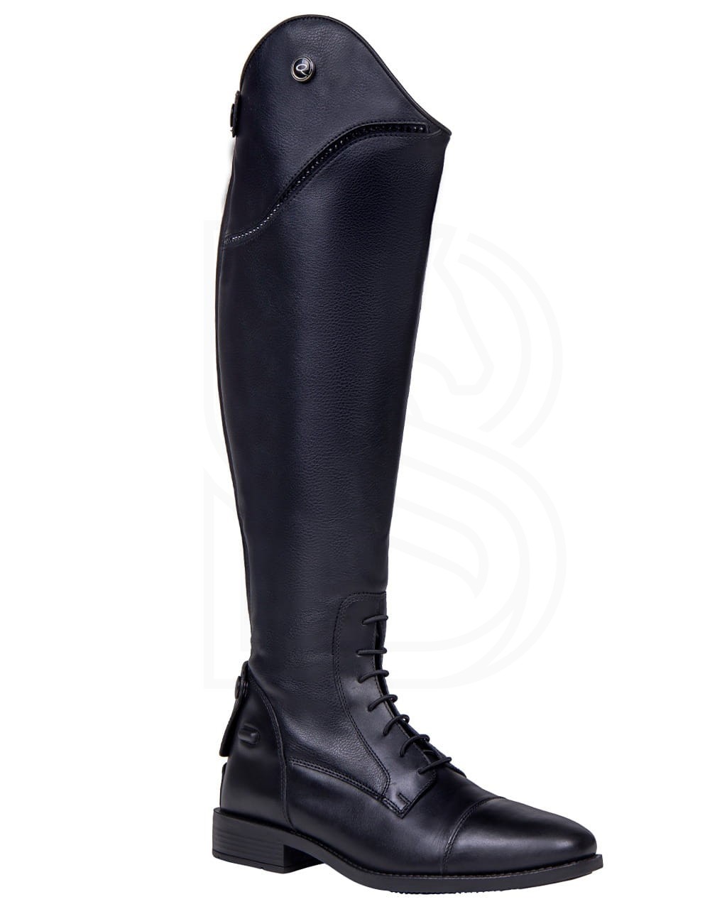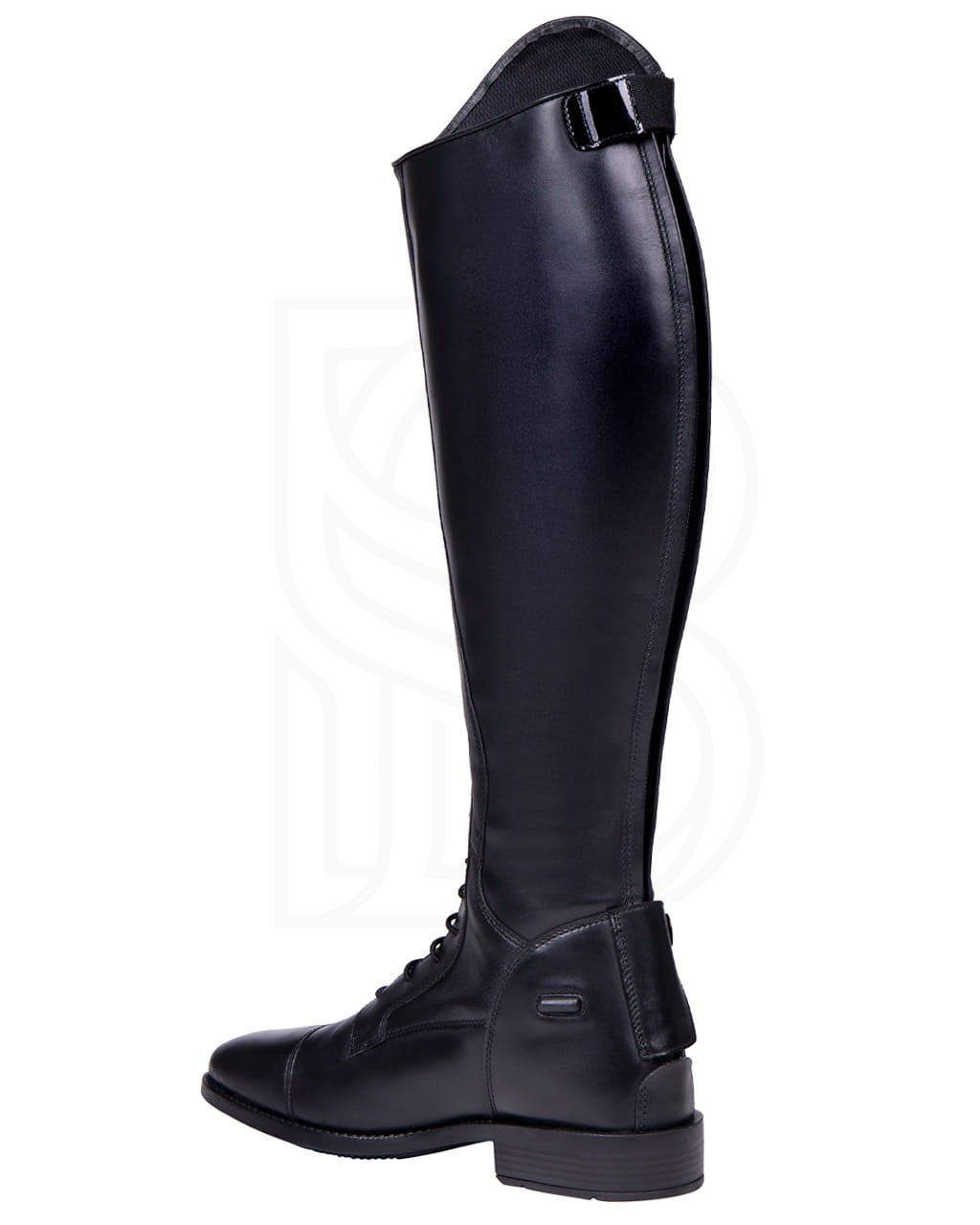 Rijlaars Lyssa Adult Zwart to eleganckie damskie oficerki jeździeckie w kolorze czarnym, wykończone subtelną ozdobą z cyrkonii/strassu na górnej części cholewki. Model łączy klasyczny, „zawodniczy” wygląd z praktycznymi rozwiązaniami zwiększającymi komfort noszenia na co dzień i na starty.
