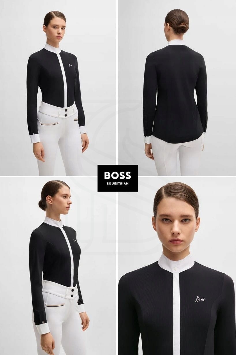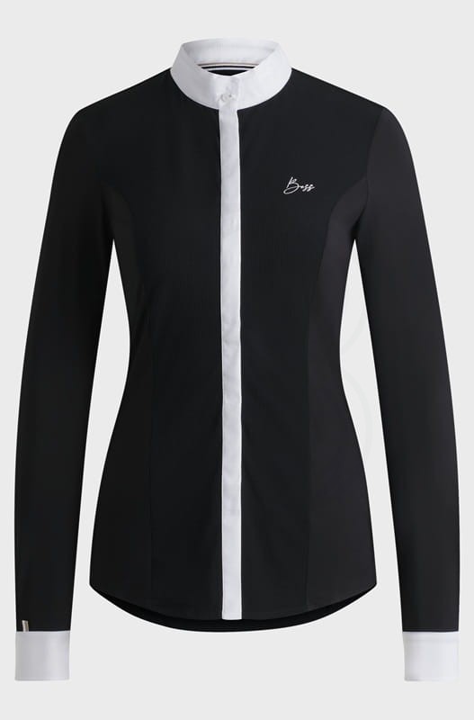 Ekskluzywna damska koszula konkursowa BOSS Equestrian Emma w kolorze czarnym (Black) to połączenie nowoczesnej elegancji, sportowej funkcjonalności i najwyższej jakości wykonania. Stworzona z myślą o zawodniczkach, które chcą wyróżnić się stylem, zachowując jednocześnie profesjonalny wygląd na czworoboku lub parkurze.